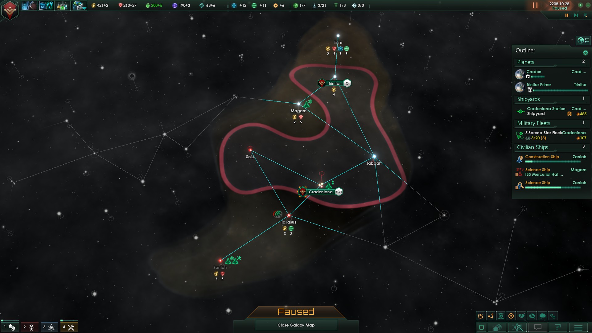 Admittedly, we still have a long way to go to colonize the enitre galaxy, but I think we have a solid base to get started. Our economy can easily sustain a growing colony, I’ve turned the corner on mineral production so now the bottleneck on expansion is Construction Ship time, not production… things are looking up