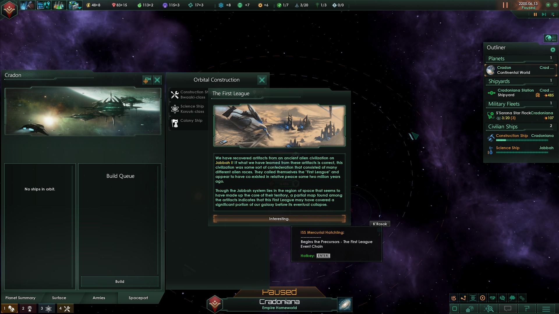 Those events aren’t hugely game-changing so far (although as this session comes to a close I get the opportunity to reactivate an ancient alien shipyard, which I hope will give me something cooler than engineering research.)