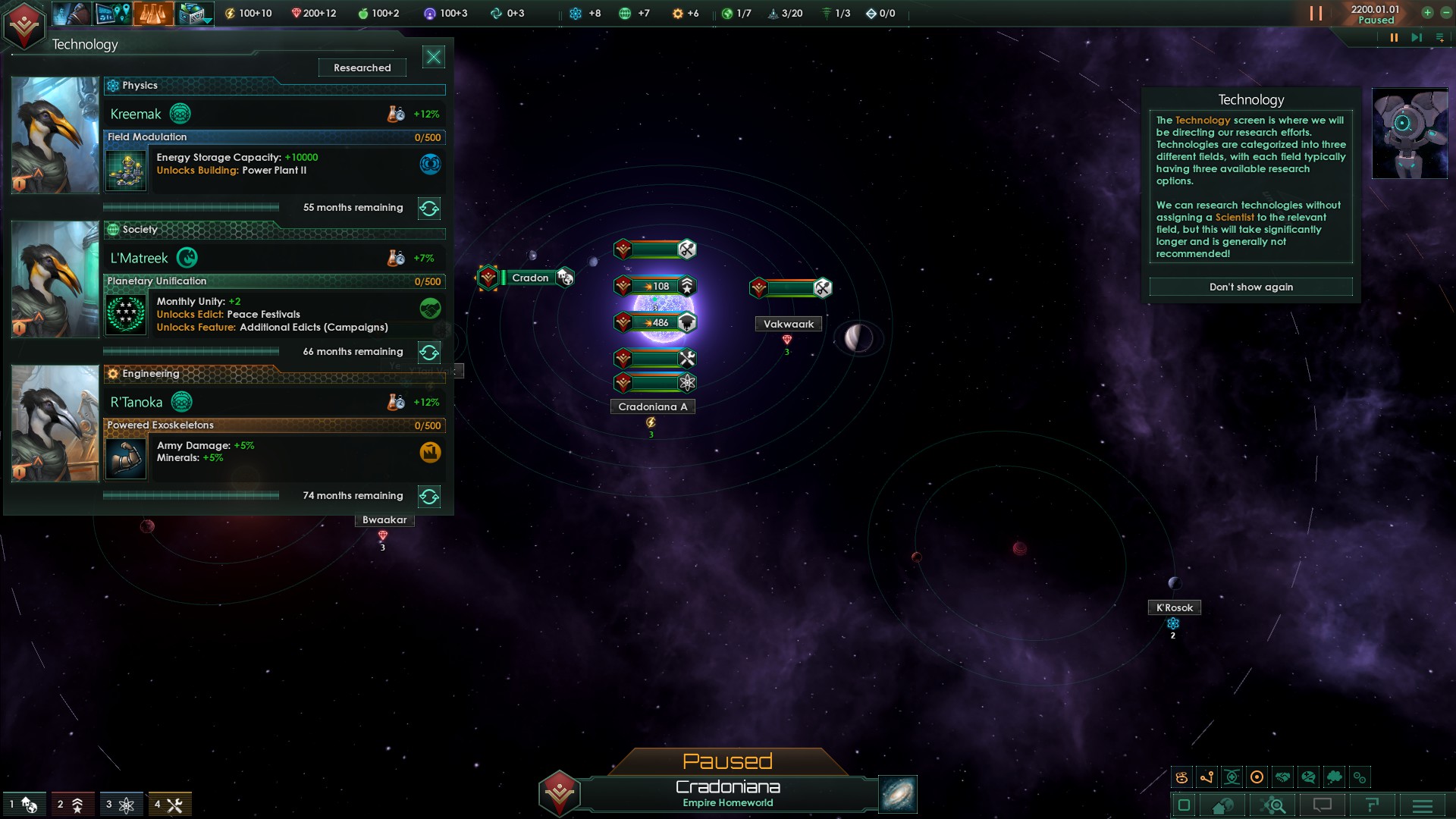 The way research works in Stellaris is that you get to pick a research goal from the list of technologies you have all the prerequisites for. So I might have, for instance, Blue Lasers available now and then not have them available the next time around. So while I think researching combat capabilities now is a waste, I can’t just ignore all combat research until I find other potential enemies because I can never be sure when they’ll next be in the list. Still, at this stage I think focusing on growth technologies is a valid decision.