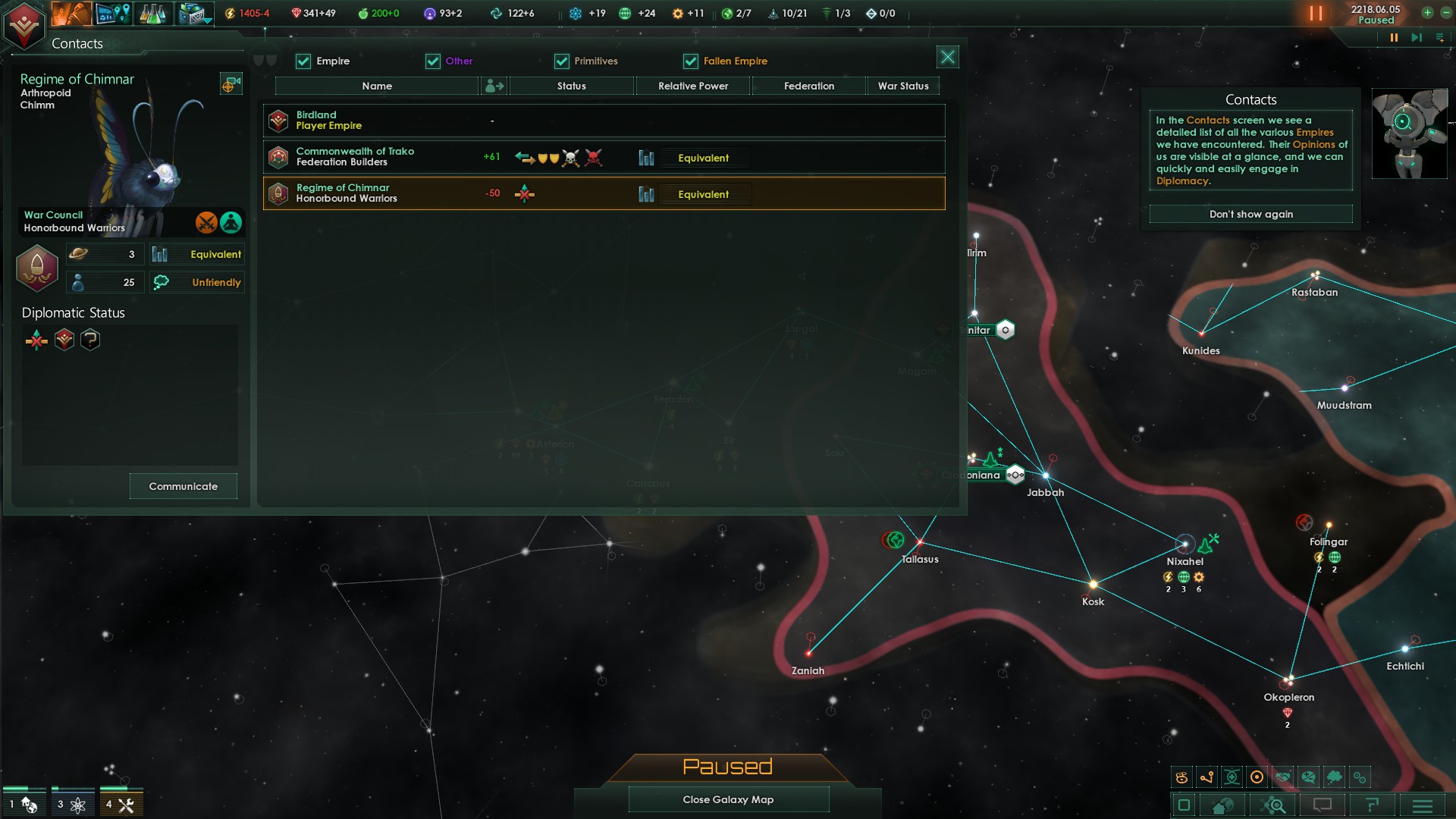 Well, our counterclockwise neighbors seem nice. I sign a bunch of deals with them (notably trading them some surplus food and energy for minerals to fuel my expansion)